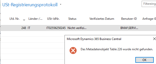 Navision 2016, 2017 (und evtl. 2015?) speichert nur „Umsatzsteuer ID existiert“ und „Registrierter Name“ und „Registrierte Adresse“ im Protokoll ab. Wenn Sie hier die weiteren Felder der Nachfolgeversionen haben möchten (Bestätigte Straße, Bestätigte Postleitzahl, Bestätigter Ort und ob die bestätigte Adresse mit der bei Ihnen hinterlegten Adresse übereinstimmt), dann sprechen Sie mich bitte an. Die Antwort von VIES ist immer die gleiche, es geht also „nur“ darum diese Antwort auch bei Ihnen sichtbar zu machen.