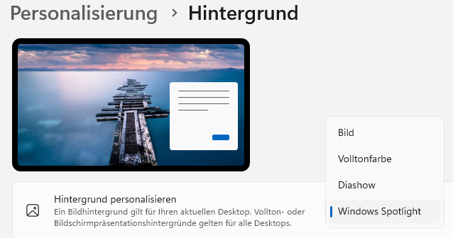 Personalisierung > Hintergrund > Hintergrund personalisieren. Wählen Sie hier „Bild“ oder „Volltonfarbe„, aber nicht die aktiven Optionen „Diashow“ oder „Windows Spotlight“. Vor allem die Diashow zeigte sich oft als Ursache des springenden Dateiexplorers. Je nach Windows-Version gibt es hier auch noch die Option der „Akzentfarbe für den Desktop-Hintergrund als Option“. Wenn Sie diese Option haben: Ausschalten. Also eine feste Farbe auswählen.